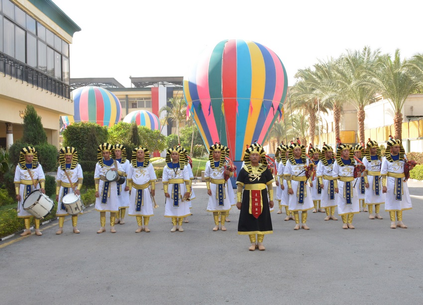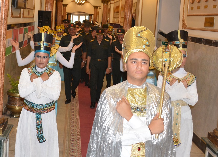• بدأت الإحتفالية باستقبال الموسيقات العسكرية وطلبة تعليم مديرية التربية والتعليم بالقاهرة الوفود والسادة الحضور بالزي الفرعونى والفساتين البيضاء حاملين الورود والأعلام